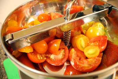 Farmer Pop and I have been busting our sweaty humps out at the farm (exactly one year old today - happy birthday, little farm) and yes, we really do have about a thousand beautiful tomato plants. Eight varieties in all, from little bitty red Sweeties to gnarly giant Beefsteaks. I spent the better part of yesterday morning scooting along the tomato rows in the sunshine, gently encouraging the plants up into the twine support lines, basking in the perfume of their leaves and grinning like a filthy, sweaty idiot. Every once in a while I'd stumble upon a ripe one and snag it for Quality Control. Yes... sweet, delicious Quality Control.
